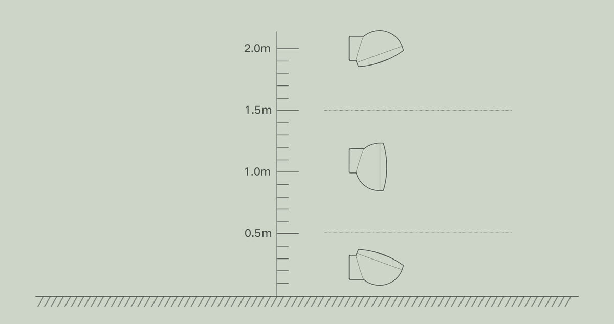 W celu dokładnego wykrywania zaleca się skierowanie światła w dół, gdy podstawa została zamontowana ponad 1,9 m nad podłogą. Z tego samego powodu zaleca się skierowanie światła do góry, gdy podstawa została zamontowana poniżej 0,5 m nad podłogą. W przypadku różnych wysokości montażu kąt należy dostosować do wzrostu użytkownika i pożądanego scenariusza użytkowania, aby uzyskać optymalny wynik.
