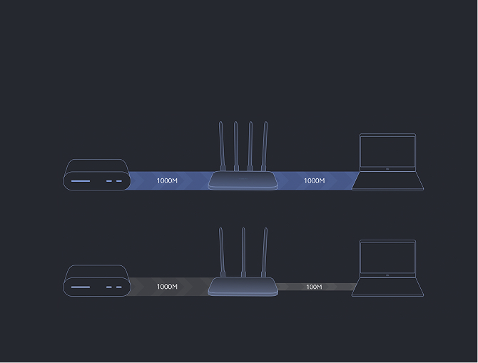 Xiaomi AC1200 to router wyposażony w jeden port WAN i dwa porty LAN o pełnej przepustowości gigabitowej, co pozwala osiągać stabilne prędkości powyżej 100 Mb/s. W porównaniu do starszych rozwiązań 100 Mb/s zapewnia znacznie lepsze wykorzystanie dostępnego łącza i płynniejsze działanie sieci.