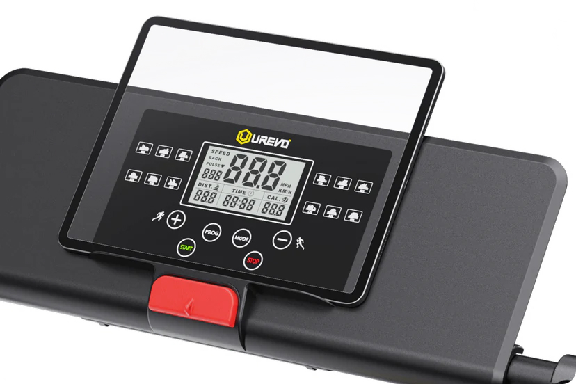 Konstrukcja pod wyświetlaczem LCD pełni funkcję praktycznego uchwytu na urządzenia elektroniczne — szeroka platforma stabilnie utrzymuje Twój telefon lub tablet, umożliwiając oglądanie filmów lub słuchanie muzyki podczas treningu.