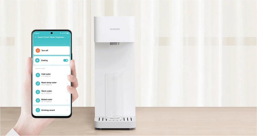 - Inteligentny dozownik wody z precyzyjną regulacją temperatury (co 1°C), błyskawicznym podgrzewaniem w 3 sekundy i funkcją szybkiego chłodzenia. Pojemność 3 l, sterowanie przez aplikację Xiaomi Home.