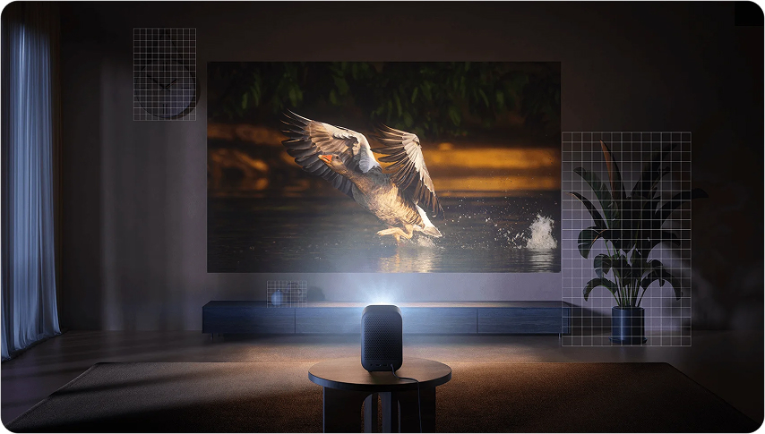 Dzięki inteligentnemu algorytmowi SI projektor samodzielnie unika przeszkód, takich jak przełączniki ścienne czy ramy obrazów, precyzyjnie dopasowując obszar projekcji dla idealnego wyświetlania.
