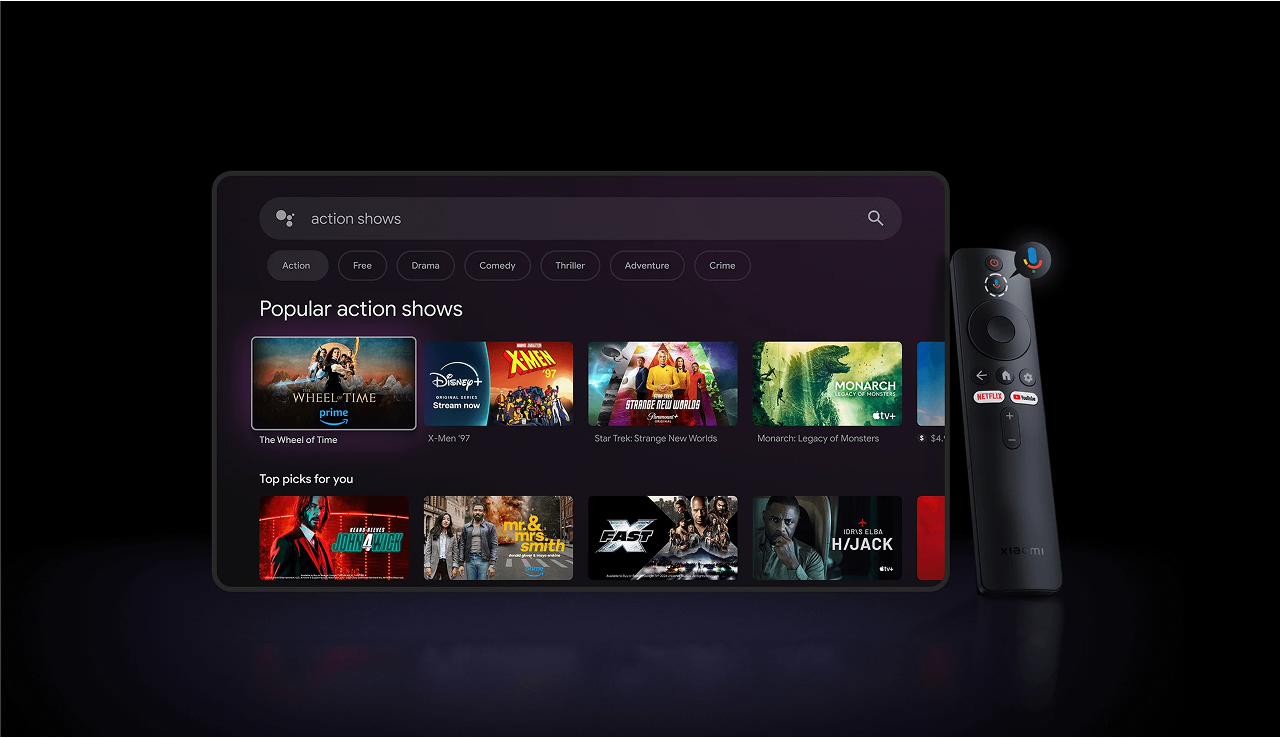 Z pomocą Asystenta Google możesz łatwo wyszukiwać filmy, uruchamiać aplikacje, odtwarzać muzykę i sterować projektorem – wszystko za pomocą głosu. Naciśnij przycisk Asystenta Google na pilocie, aby rozpocząć*.