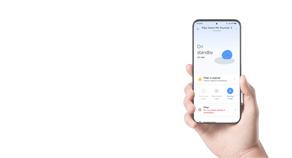 Aplikacja Xiaomi Home wysyła powiadomienia o niskim poziomie wody, konieczności wymiany filtra* i stanie baterii, zapewniając wygodną i bezproblemową opiekę nad zwierzęciem.