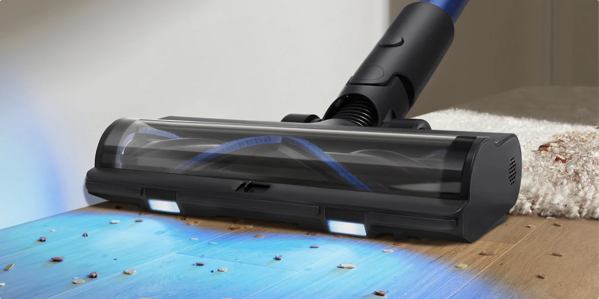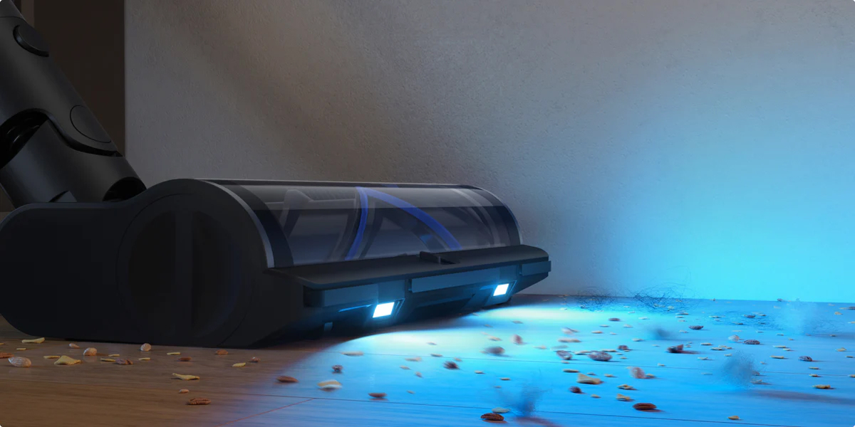 Wielofunkcyjna szczotka z diodami LED Celeste delikatnie oświetla podłogę, pomagając dostrzec kurz nawet w słabo oświetlonych miejscach i na twardych powierzchniach.