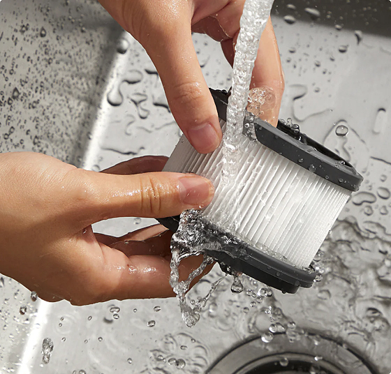 Wałek szczotki, filtr i pojemnik na kurz można łatwo odłączyć i umyć, co ułatwia utrzymanie urządzenia w czystości. Filtr można szybko wyjąć i ponownie zamontować, dzięki czemu konserwacja jest prosta i wygodna.