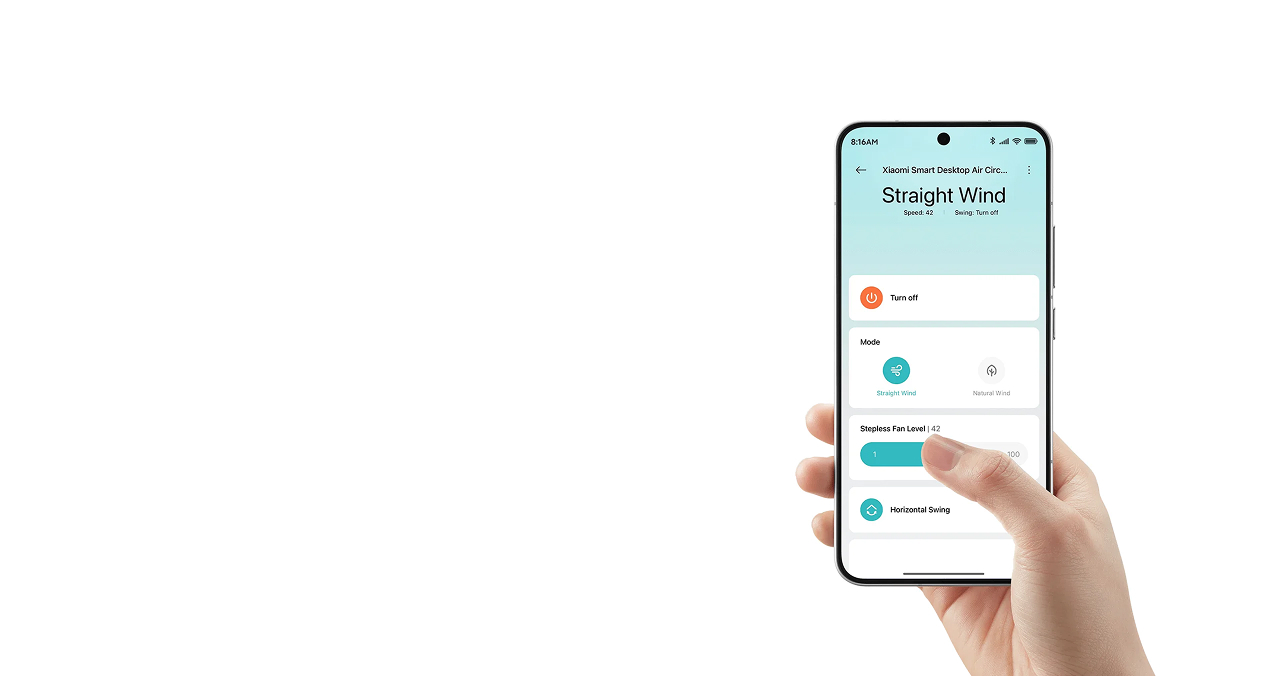 Silnik inwerterowy DC działa płynnie i stabilnie. W aplikacji Xiaomi Home możesz wybrać spośród 100 różnych ustawień prędkości, aby idealnie dopasować nawiew do swoich potrzeb.
