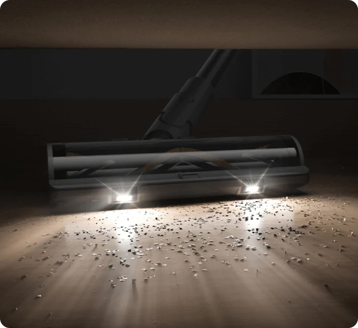 Wbudowane diody LED w szczotce głównej oświetlają ciemne przestrzenie pod meblami i w narożnikach, pozwalając dokładnie usunąć kurz i zanieczyszczenia z trudno dostępnych miejsc. Teraz sprzątanie jest jeszcze bardziej skuteczne.