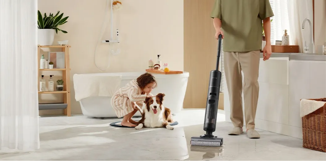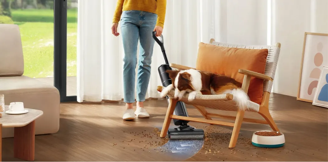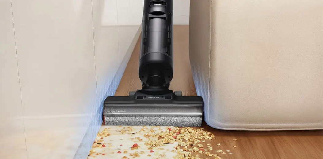 Szczotka z elastycznym skrobakiem skutecznie usuwa włosy i sierść, kierując je do zbiornika na brudną wodę. Dzięki technologii Dual Edge Cleaning odkurzacz precyzyjnie czyści krawędzie, ściany i listwy, zapewniając równomiernie wysprzątaną podłogę.