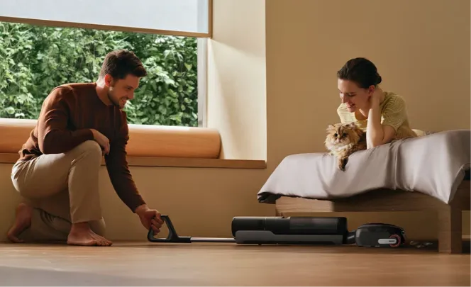 Konstrukcja pionowego odkurzacza Dreame H15 Pro FoamWash pozwala położyć go całkowicie płasko i wyczyścić przestrzenie pod łóżkiem, sofą czy szafą. Korpus ma wysokość 14 cm, a głowica 10,6 cm. Zbiornik na brudną wodę został zaprojektowany tak, aby chronić silnik przed zalaniem, a siła ssania pozostaje stabilna niezależnie od kąta nachylenia. Tylne kółko typu Omni ułatwia obracanie urządzeniem, zmniejszając wysiłek i umożliwiając szybsze oraz wygodniejsze sprzątanie.