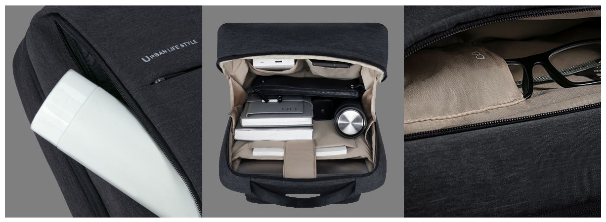 Mi City Backpack 2 został wyposażony w dwie komory do najczęściej używanych przedmiotów. Boczna kieszeń PVC jest przeznaczona dla termosu lub parasola, kieszonka po prawej stronie jest idealna jako futerał na okulary dzięki miękkiej, flanelowej wyściółce. Duża ilość wewnętrznych kieszeń gwarantuje swobodę wyboru.